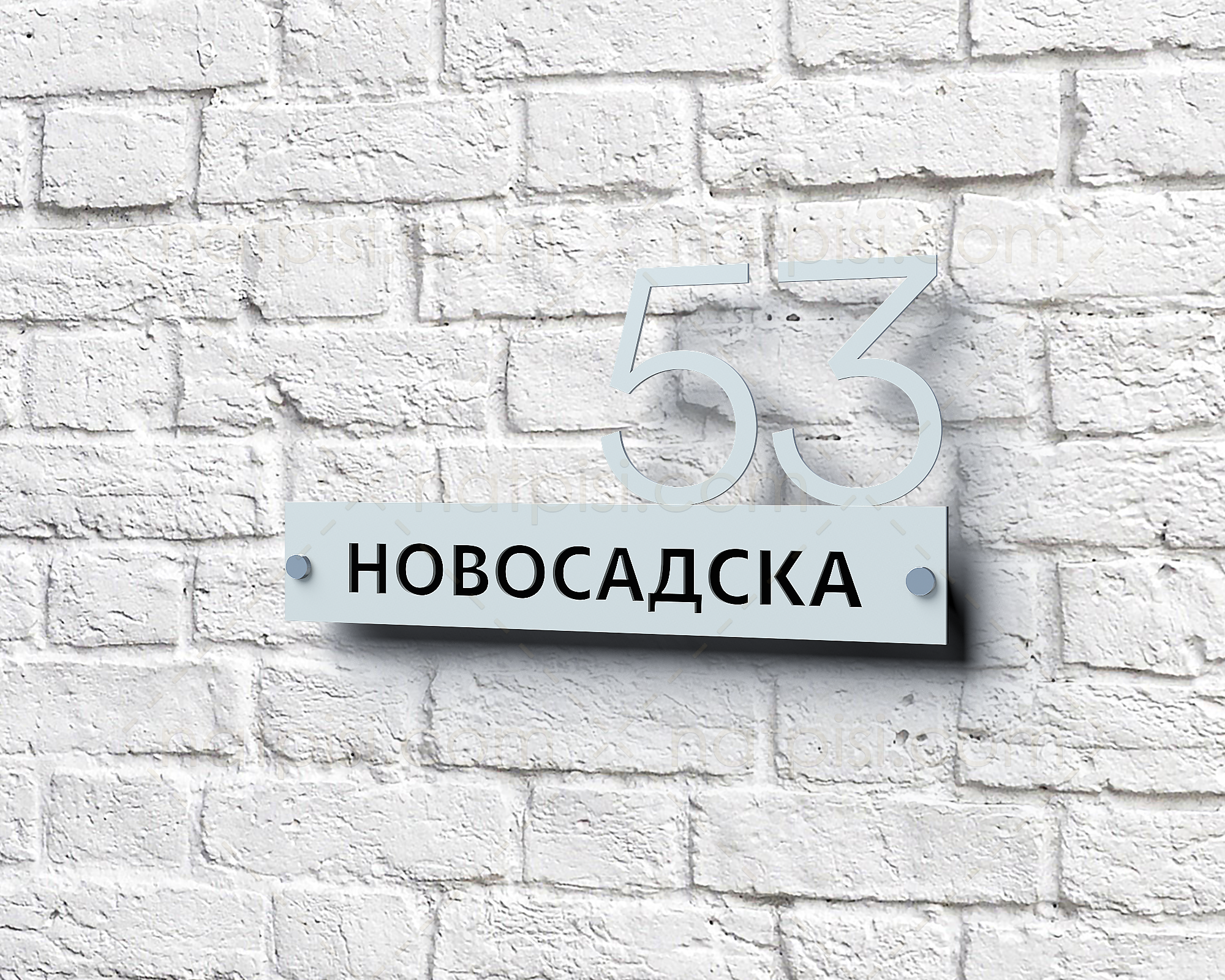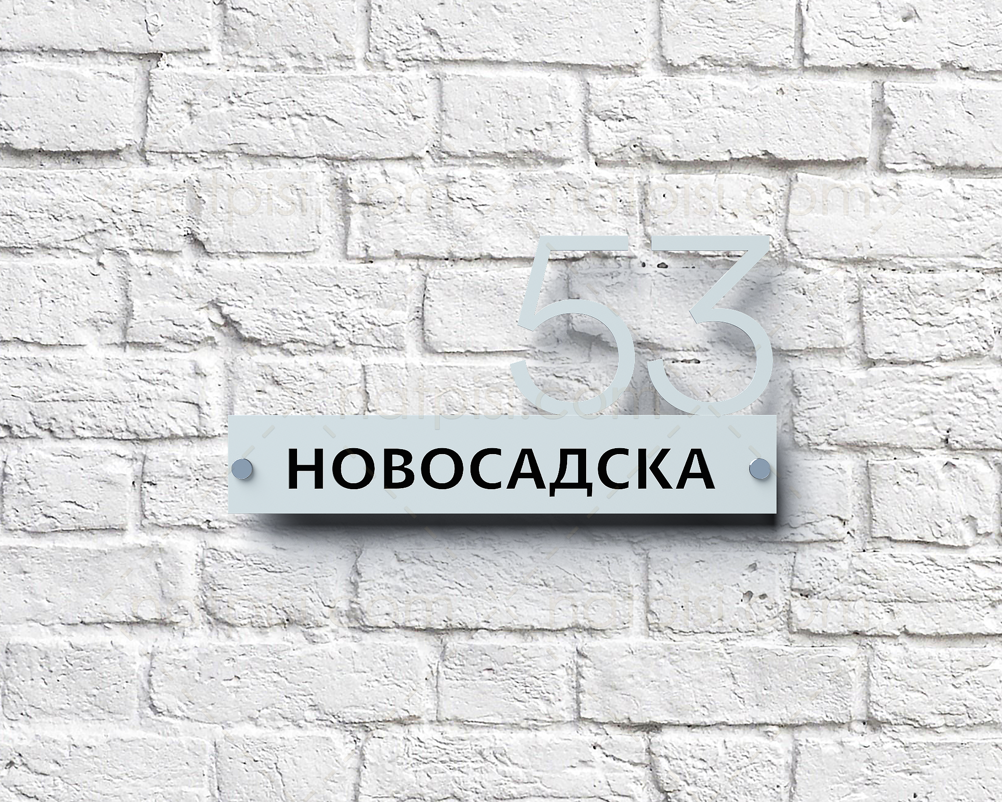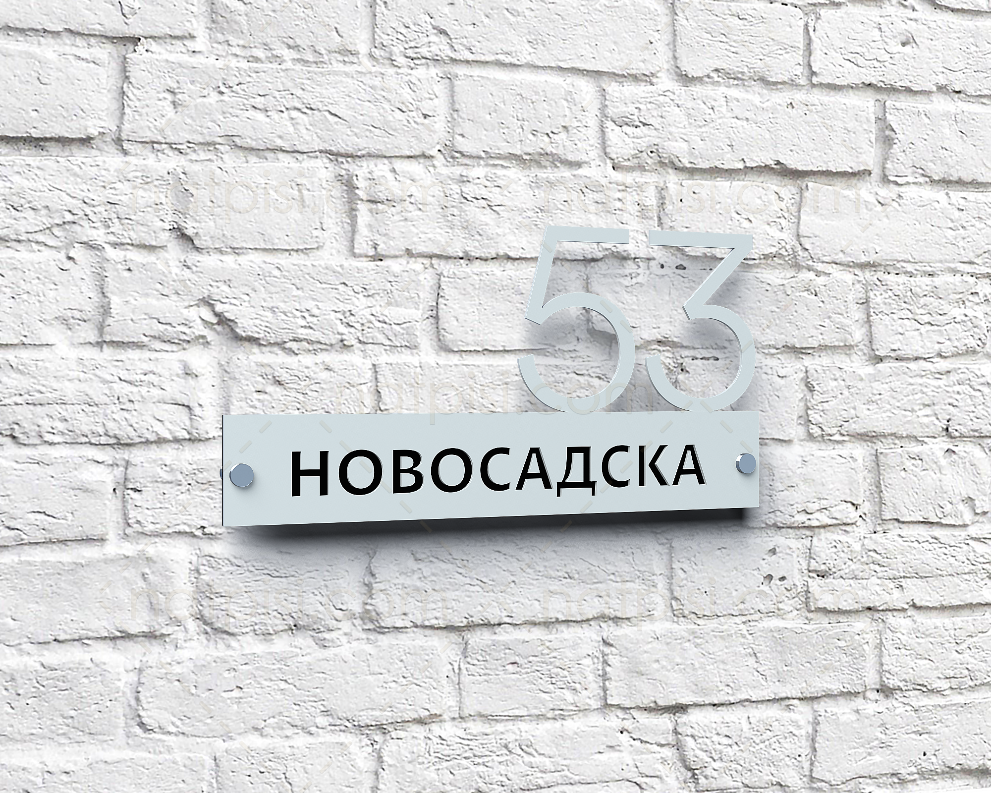 * Moderan kućni broj sa nazivom ulice izrađen od pleksiglasa debljine 3mm, u beloj mat ili sjajnoj završnoj obradi.